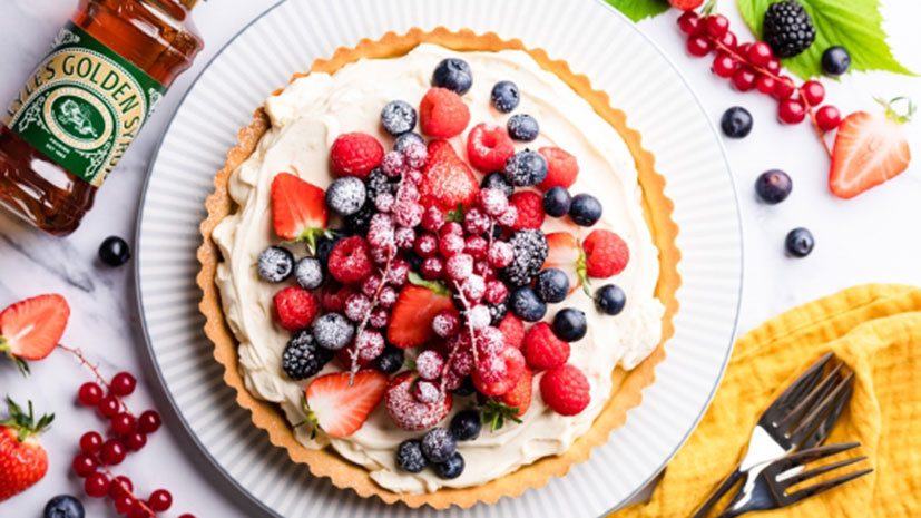 - Make the crust: Preheat oven to 170°C . In a large bowl, whisk together flour, sugar, and salt. Add golden syrup and melted butter and stir until dough forms. Press mixture into a 9” tart pan with a loose bottom, pressing until the dough is smooth. Prick all over with a fork and bake until golden, 25 to 30 minutes. Let cool completely.