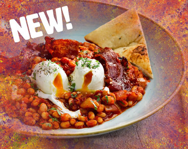 - Warm the poached eggs, divide the beans into serving bowls top with poached eggs, bacon and yoghurt, garnish with coriander and sliced green chilli if you like, serve with naan breads