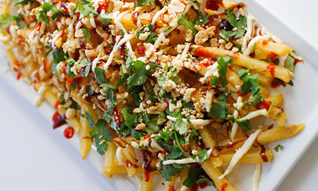 - When the fries are done, season with a pinch of salt if desired. Pile them on a long oval or rectangular plate. Drizzle with hoisin, sriracha, and garlic mayonnaise. Start with 2 teaspoons of sriracha and adjust to preference. Top with crushed peanuts and chopped cilantro.