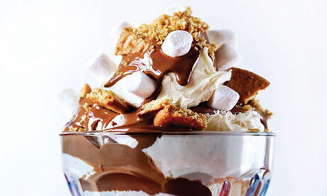 - Put three scoops of ice cream in a sundae glass and pour over the melted chocolate, then sprinkle with the crushed McVitie’s Digestive© and the marshmallows and serve immediately.