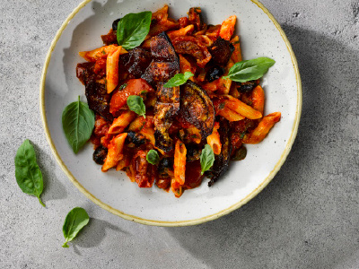 - Toss the cooked pasta with the sauce and serve into your chosen bowl, top with the aubergine bacon and a drizzle of oil.