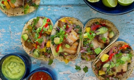- To make the salsa, concasse the tomatoes leaving the skin on if you wish. Peel the red onion, brunoise each (into small cubes) and mix. Add the chopped coriander. Squeeze 2 limes and mix in just before serving. Wedge the remaining limes.