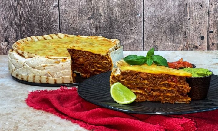 - Layer the mix evenly on top of the tortilla, and repeat this 5 times. On the top layer, spread the grated cheese. Bake this in the oven at 180C until it is golden brown. Allow the stack to cool before slicing the tortilla into wedges.
