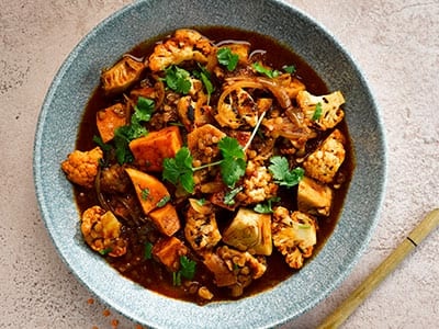 - Then add the stock, tomatoes and cook the lentils until they are soft. Then add the cauliflower and sweet potato, and cook for a couple of minutes to warm through.