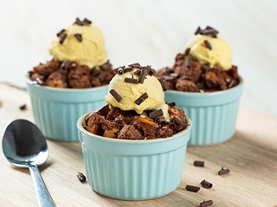 - Serve warm with a scoop of vanilla ice cream and garnish with Callebaut® dark chocolate blossoms.