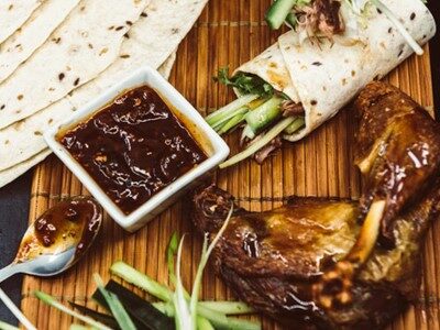 - Place the shredded duck down the centre of the wrap and scatter the cucumber batons and shredded onions.