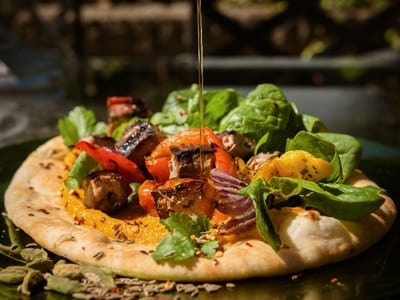 Naans are moving on from being the usual accompaniment to a curry dish. Instead, warm and top with roasted vegetables, hummus, fresh coriander and spinach for a twist on the open topped sandwich.- Put all the ingredients for the hummus into a food processor and blend until smooth, set aside to cool.