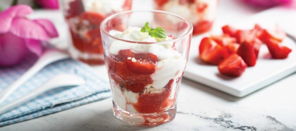 - Gently fold the whipped cream, crushed meringues and cut strawberries together. Decant into serving dishes.