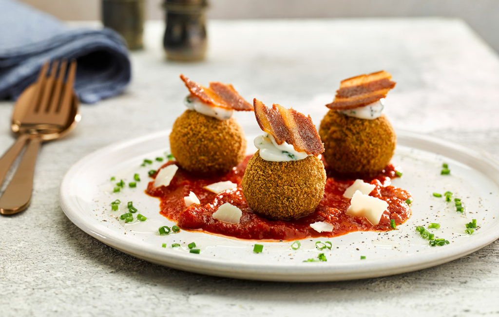 - Gently warm the sauce and place onto your plate then top with the arancini, truffle mayo, crispy bacon and grated cheese, finish with more chopped chives and serve.