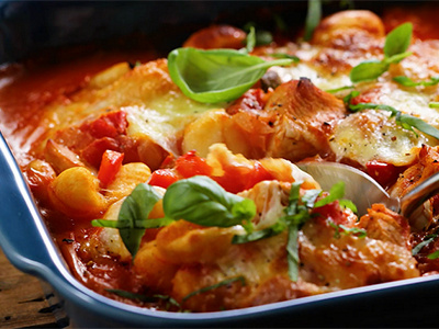 - Bubble for 10-15 minutes, stirring occasionally, until the gnocchi is soft and the sauce has thickened. Season, stir through the torn basil leaves, then transfer to a large ovenproof dish.