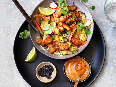 - Finely slice the spring onions, red cabbage and radishes and place in a bowl. Make ribbons of carrot and cucumber using a peeler and add to the bowl, along with the coriander leaves. Top with the satay dressing and finally add the noodles and mix until coated.