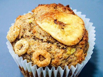 - Line the muffin tins with the cases, spoon in the mixture until almost full. Top each one with a few Cheerios & a banana chip.