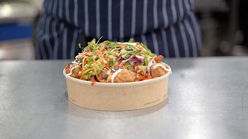 - Layer up your dirty fries, with the sweet potato fries at the bottom, then the mock chicken, smashed avo, slaw, pickled onions and sliced spring onions