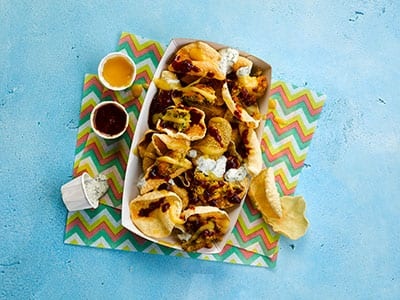 A fun fusion of Mexican and Indian cuisine. ‘Pachos’ or poppadom nachos are something that we’ve seen on the London street food scene and loved the idea of. It’s a perfect way to layer textures with the bold flavours of Indian cuisine. We’ve used the dressings that can also be used on salads to allow you to sweat your assets. However you could make your own version using sauces like hot sauce, curry sauce or natural yogurt and toppings like pomegranate seeds, a crunchy Bombay mix and crushed samosa. The choice is yours.
