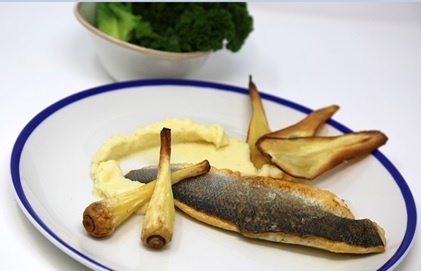 - Assemble the elements in a serving dish of your choice, starting with the puree, seabass and then topped with heritage and crisped parsnips, drizzle with a little olive oil, top with a pinch of salt and serve alongside the kale