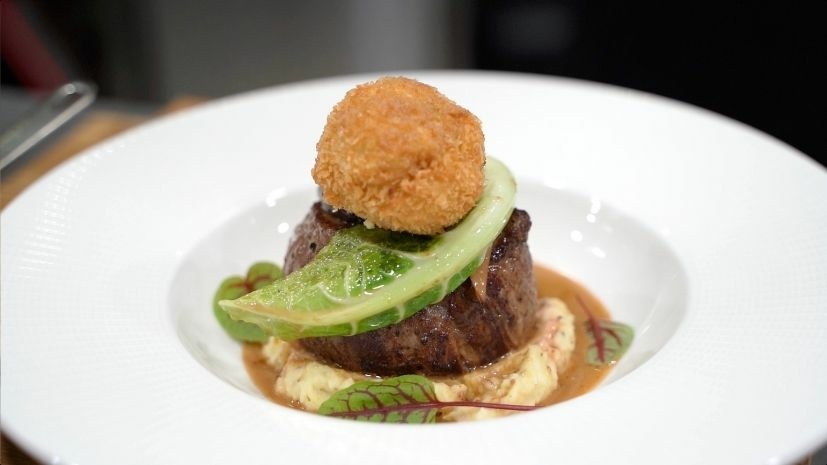 - Place the mustard mash on the plate and top with the steak then the croquettas and a sauce of your choice.