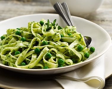 - To serve, mix the pea pesto with the tagliatelle, and add two table spoons of pasta water to loosen it up. Serve in pasta bowls, with a final drizzle of olive oil, a sprinkle of mint and extra parmesan shavings