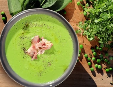 - Garnish each serving with a swirl of cream and a few of the reserved peas.