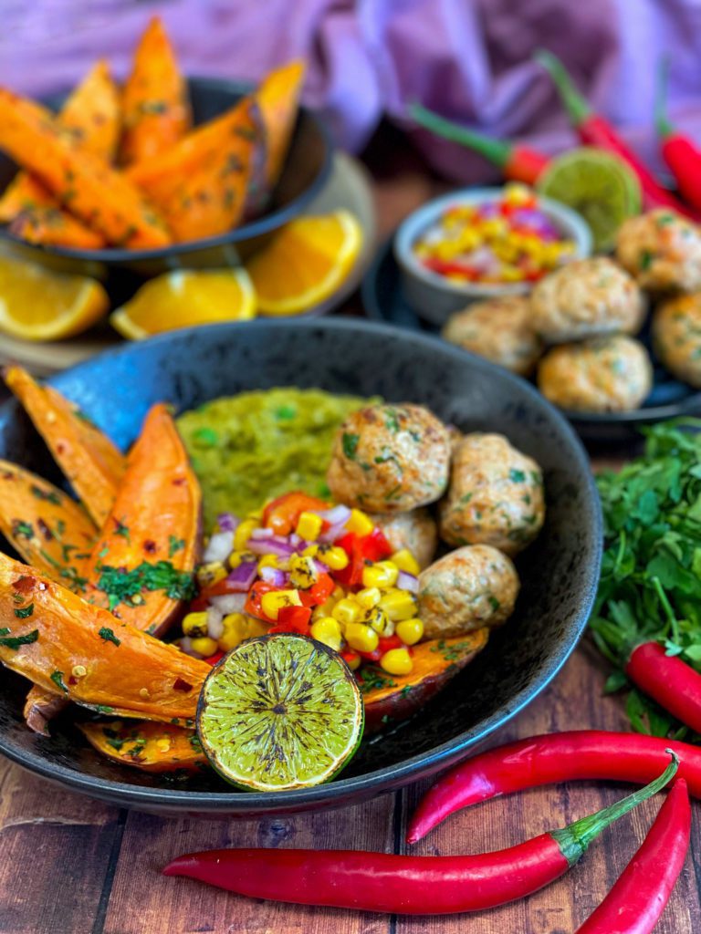- Cook the meatballs and finally, serve with the wedges, pea and chipotle crush, and red pepper salsa.