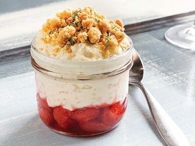- Arrange the strawberries in a serving dish, top with the warm creamy Philadelphia rice pudding and cover with the golden crumble.