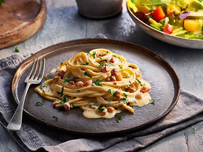 - Add the spaghetti to the pan of bacon and stir to coat. Pour in the egg mixture, adding a splash of the cooking water if needed to loosen the sauce. Serve immediately alongside a fresh salad.