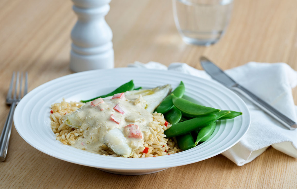 - Finally drain the rice and plate with the cooked cod, top with the curry sauce and garnish with sugar snap peas and fresh coriander (optional).