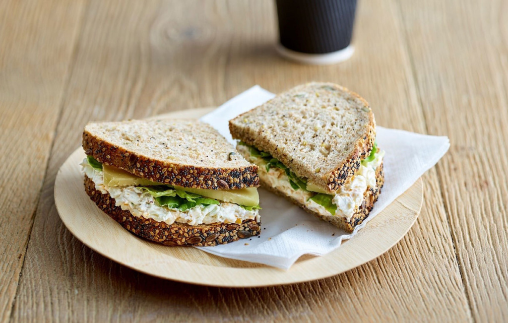 - Construct the sandwich by putting half the cheese and onion spread on each slice of bread, then add the slices of mature cheddar cheese and the lettuce leaves and close.