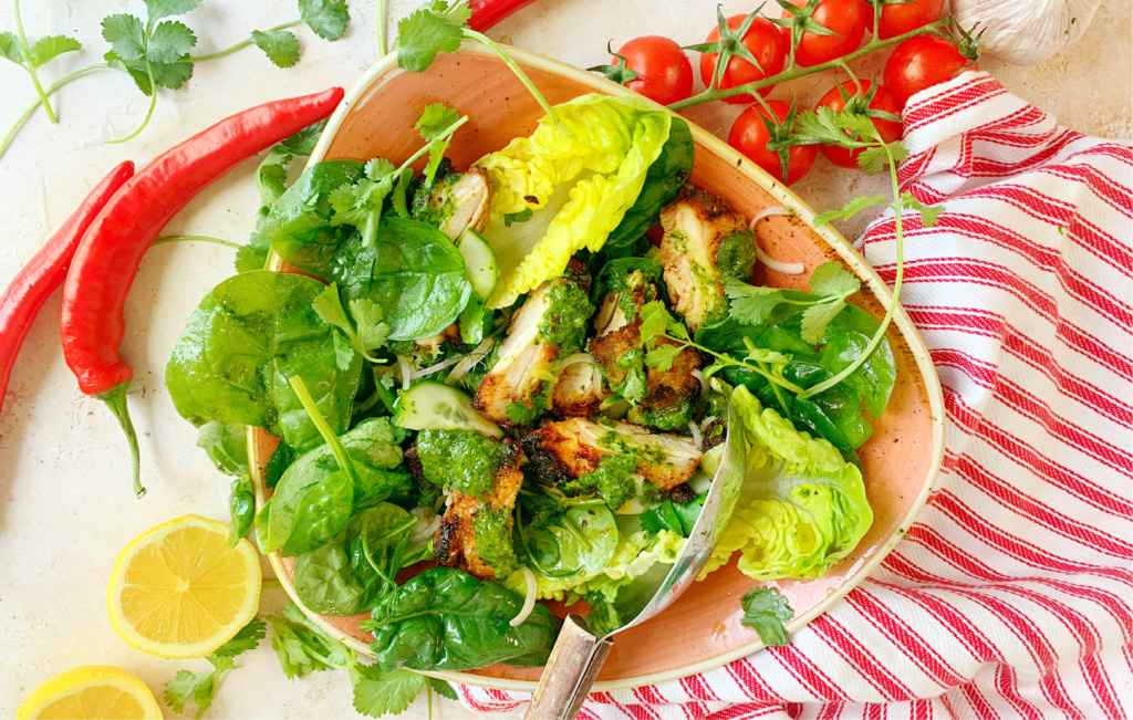 - Heat a grill plate and bar mark, then cook the chicken until 75°C, then rest and slice.