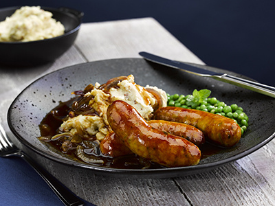 - To serve place the mash on the plate and top with two sausages then drizzle with the cider sauce.