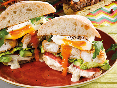 - Spread with tartare sauce, then 3 slices of tomato on the bun, then avocado slices, little gem, cooked haddock goujons, hot poached egg, fresh rocket & cracked black pepper.