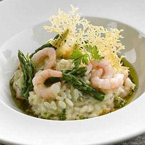 - Add in the asparagus tips, butter, cream, parmesan and prawns and fold in well - heat through and serve with parmesan garnish.