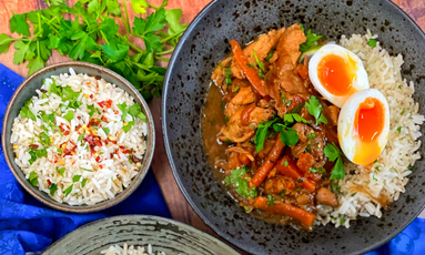 - Place the cooked rice into a bowl and top it with the chicken and soft boiled egg. Serve it with crushed red chilli if you wish to add some spice.