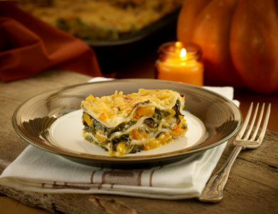- Build your lasagne in a lightly greased ovenproof dish, starting with a thin layer of pumpkin and spinach sauce, following with lasagne sheets and then again with the sauce. Repeat until all ingredients are used.