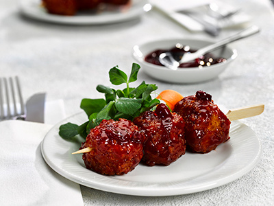- To assemble, skewer three bites and place on your chosen dish and place your dip and salad garnish along side.