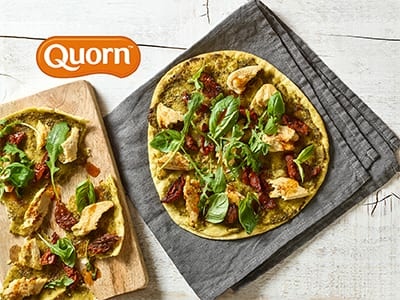 Flat bread based pizza, smothered with green pesto topped with torn Quorn fillets, sun-dried tomatoes, freshly torn basil, rocket leaves and drizzled with olive oil.- Preheat the oven to 190°C/Gas Mark 5.
