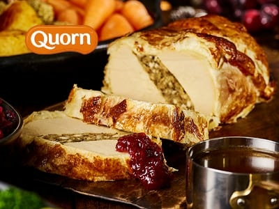 - Slice the Quorn roast in half horizontally. Spread the stuffing on one half of the cut roast and replace the other half on top.