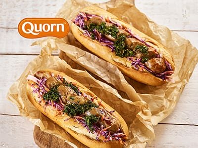 - Cut each Quorn sausages into 5 on the diagonal and place across the top of the coleslaw. Top with a spoonful of the sauce.