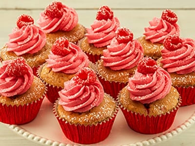 - Place in a piping bag and top the cupcakes with the buttercream icing and a fresh raspberry before serving.