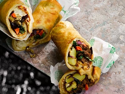 - Lay the Yorkshire pudding on a board and fill with 100g of the roasted vegetable mix and 20g of blanched greens.