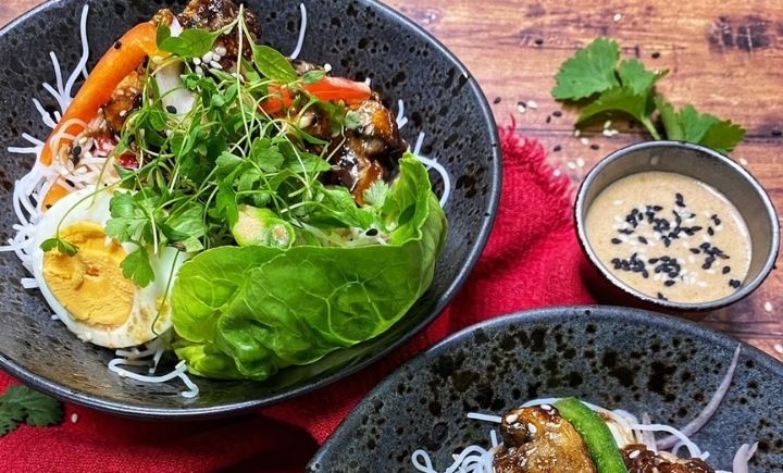- Arrange the noodles into a bowl and top with vegetables, eggs, and the cauliflower mix. Finally, finish off with the dressing, a sprinkle of sesame seeds and some fresh micro-coriander to garnish.