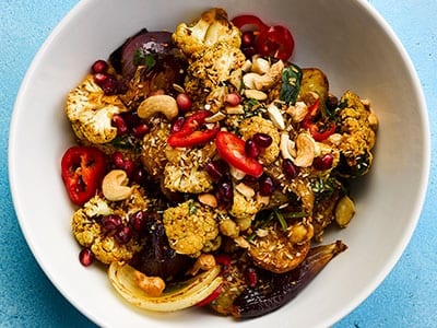 - Mix the cauliflower, potatoes, red onions, oil and masala goa paste together and roast for 20 minutes, then allow to cool.
