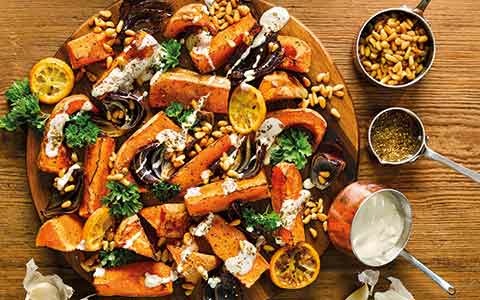 - Put the squash and red onion wedges in to a large bowl then add the oil, 5g of the salt and black pepper and toss well. Place onto an oven tray and roast for 35 minutes until the vegetables are roasted. Remove from the oven and leave to cool slightly before finishing the dish