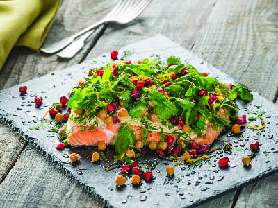- Top houmous with pea shoots, whole cooked chickpeas (tinned is fine), lemon zest, dill, coriander and pomegranate seeds.