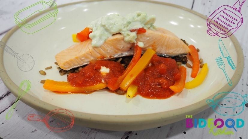 - Place the salmon on a baking tray and the sliced peppers and bake in the oven for 180°C for 10 -12 minutes till golden but still soft to touch.