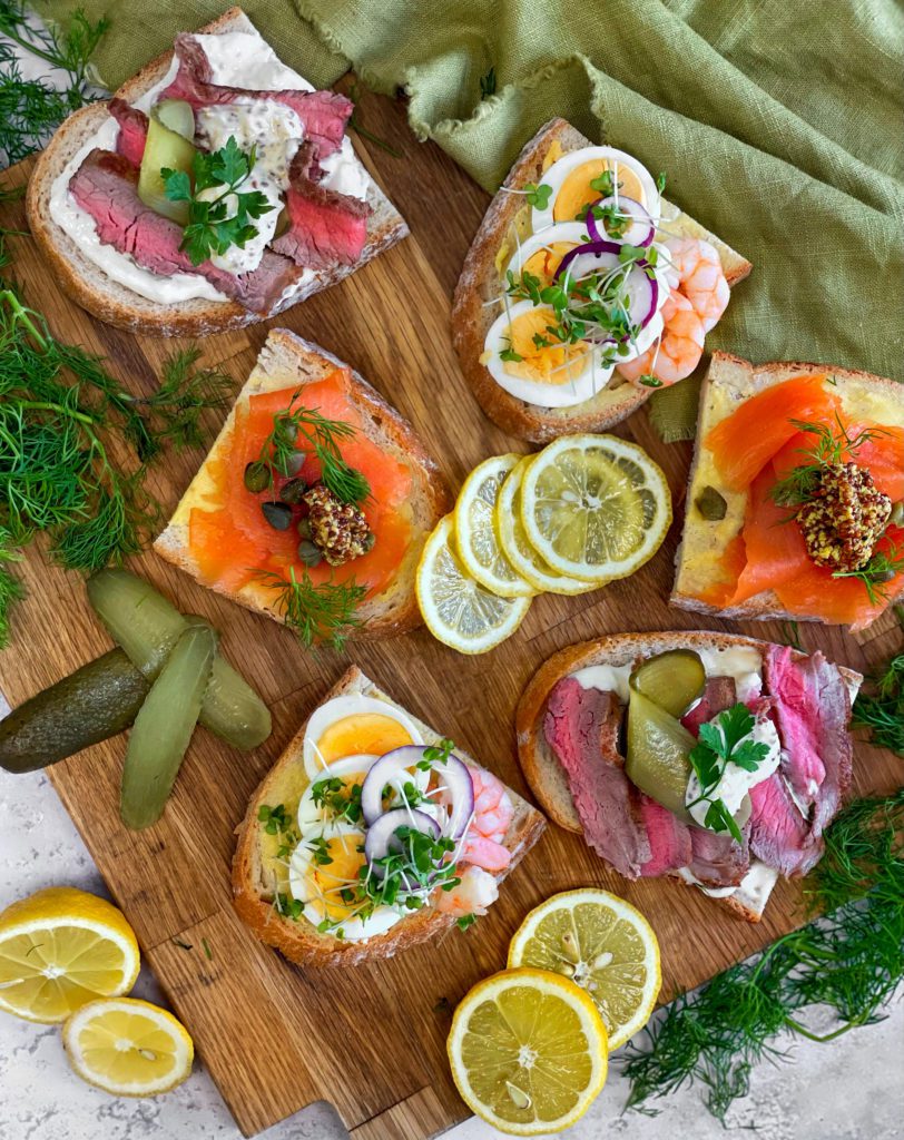 - Top one batch of bread with smoked salmon slices, capers, dill and mustard.
