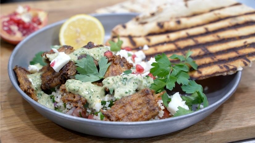 - Assemble all the components and top with the lamb, pomegranate seeds, Zhough dressing and fresh herbs.