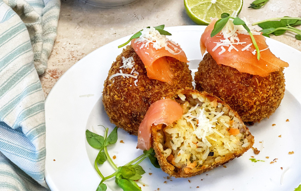 - Depending on what size you want place, half the quantity you need into damp hands, flatten slightly and push the mozzarella and some smoked salmon in the centre. Top with remaining half quantity and form a ball.