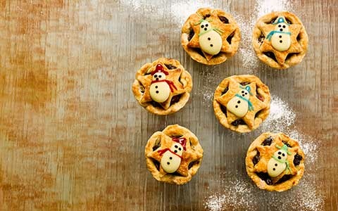 - Remove the marshmallow mix and stir to soften and smooth, place in a piping bag with a plain nozzle. Pipe a snowman body and head on each mince pie and place the pies in the fridge to set