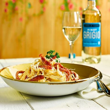 - When the pasta is ready, lift out from the pan of water and add into the frying pan with the bacon and garlic.