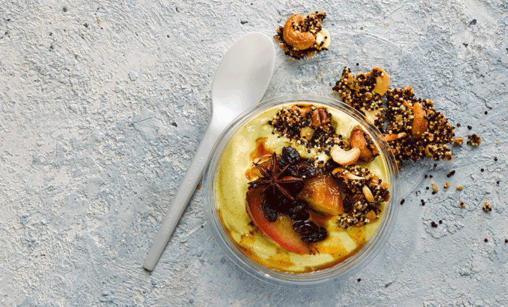 - To assemble, place equal amounts of the yoghurt mix into you packaging, top with equal amounts of sultana mix and finish with chunks of quinoa granola.